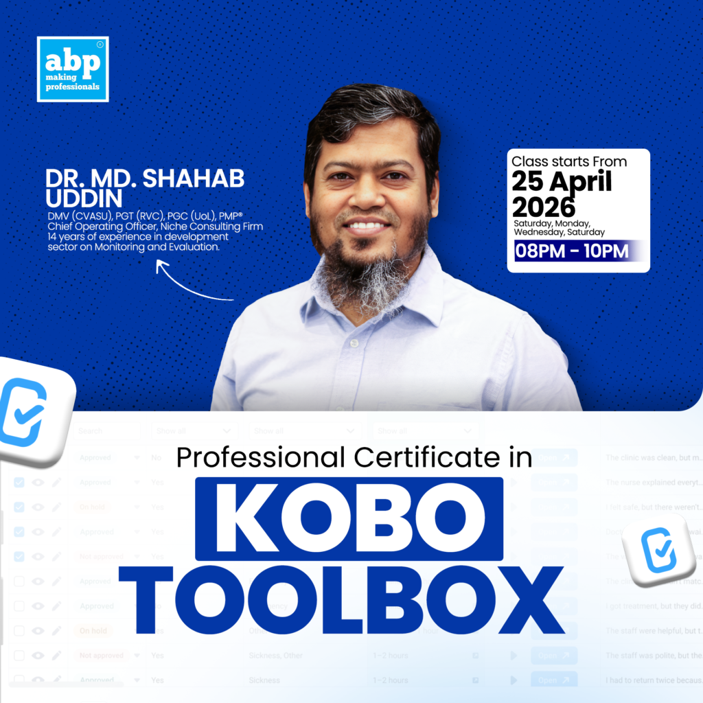 ৪ দিনের এই Professional Certificate কোর্সে শিখবেন কীভাবে KoboToolbox & XLSForm দিয়ে বাস্তব প্রজেক্টের জন্য data collection form তৈরি, deploy ও analyze করতে হয়।
